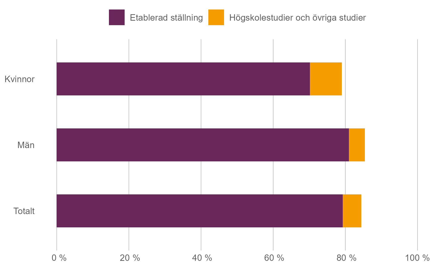 Efter tre år arbetar 70 procent av kvinnorna och 81 procent av männen. Andelen som studerar vidare är 9 procent av kvinnorna och 4 procent av männen.