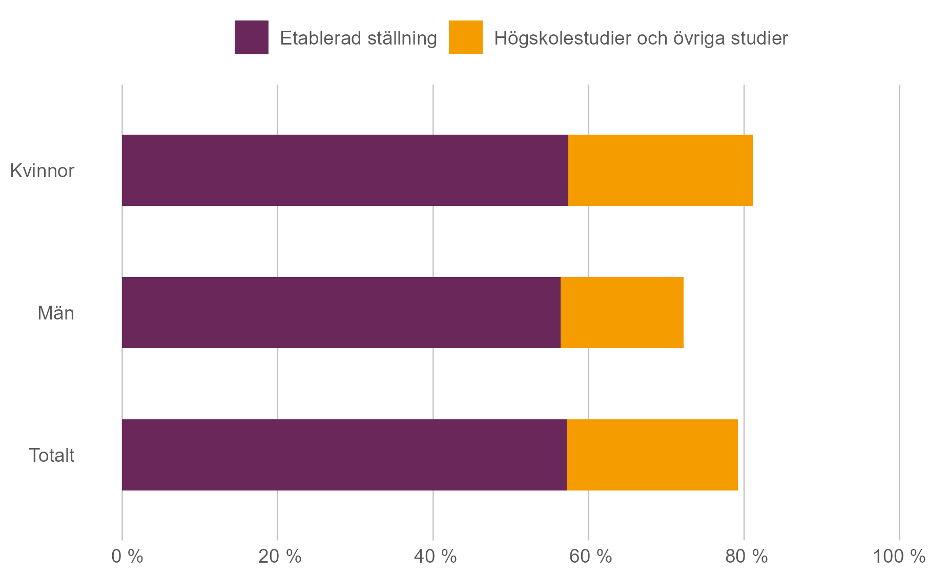 Efter tre år arbetar 57 procent av kvinnorna och 56 procent av männen. Andelen som studerar vidare är 24 procent av kvinnorna och 16 procent av männen.