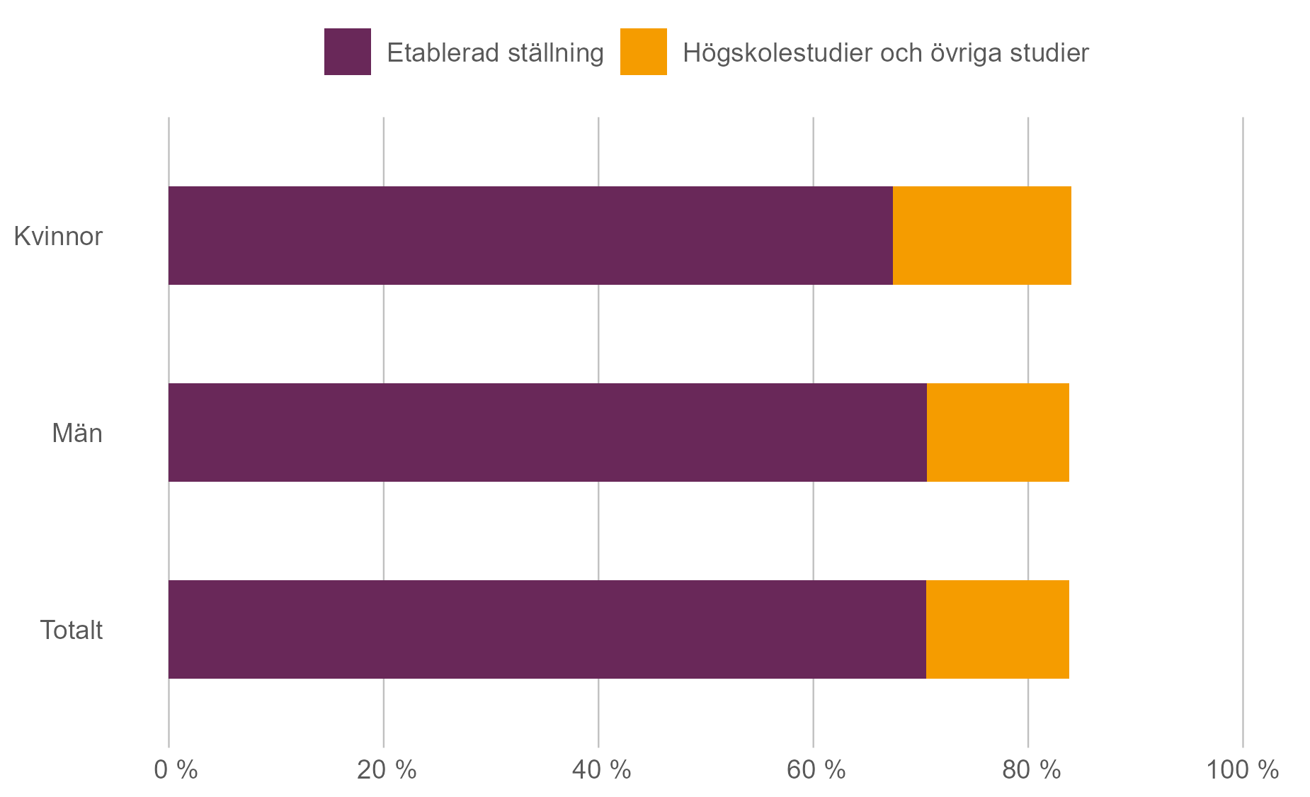 Efter tre år arbetar 67 procent av kvinnorna och 71 procent av männen. Andelen som studerar vidare är 17 procent av kvinnorna och 13 procent av männen.