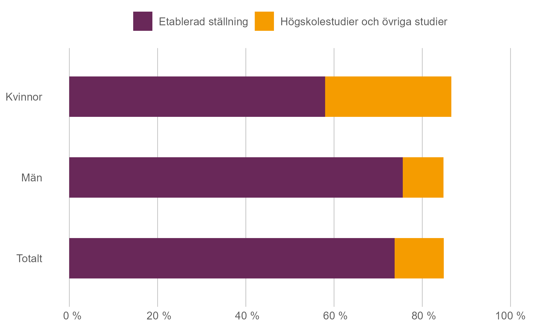 Efter tre år arbetar 58 procent av kvinnorna och 76 procent av männen. Andelen som studerar vidare är 29 procent av kvinnorna och 9 procent av männen.
