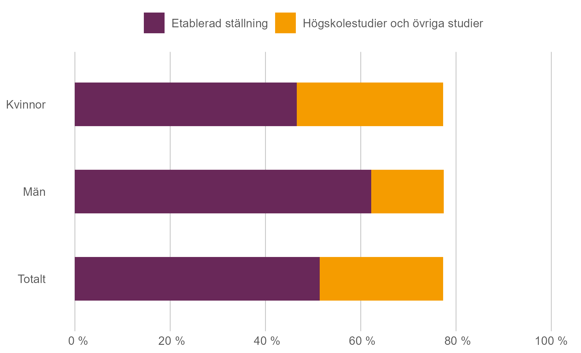 Efter tre år arbetar 47 procent av kvinnorna och 62 procent av männen. Andelen som studerar vidare är 31 procent av kvinnorna och 15 procent av männen.